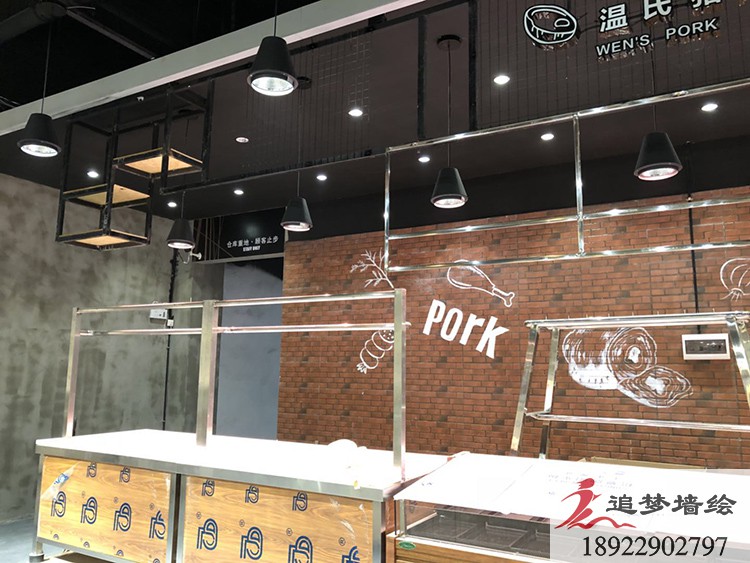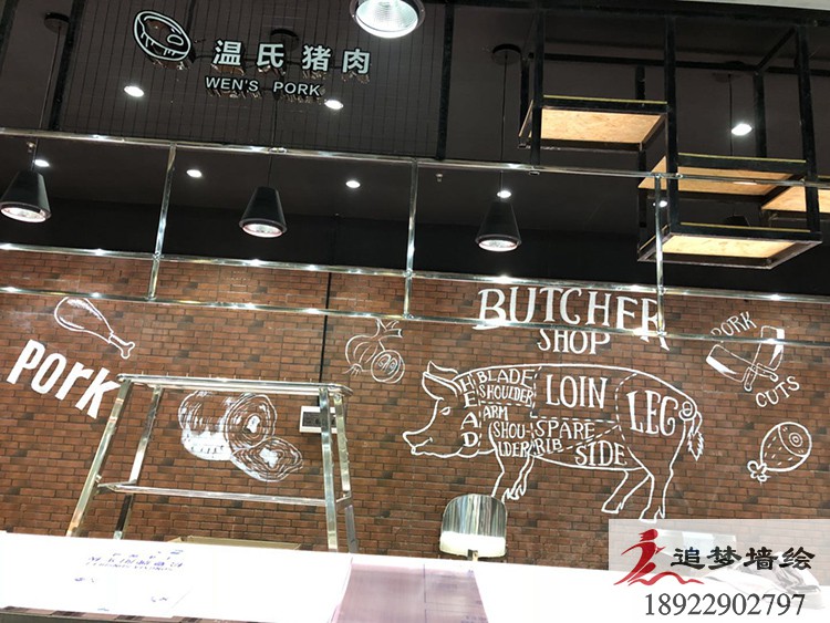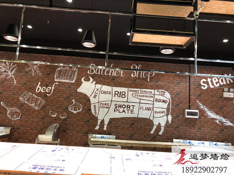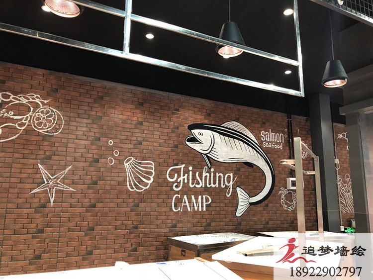 墻繪項(xiàng)目介紹:按照客戶的要求,四個(gè)店鋪分別做了不同的主題,根據(jù)要求制作了線條型的海鮮,肉類等等,得到了客戶滿意的贊賞