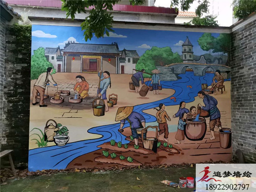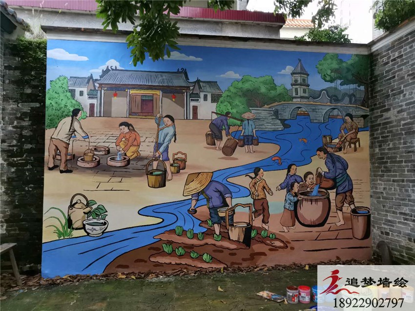 墻繪項目介紹:應村里人的邀請,聯合廣州美術學院教授,為位于番禺的墻體進行墻體彩繪工作,我們這邊出了設計方案。從樣稿確定到全面設計再到施工完成,得到了老板的極大支持和贊成。該套設計方案主要采用三元井和古代建筑的結合,運用了復古風,表現人們在井邊的辛勤勞作,突出了年代感。