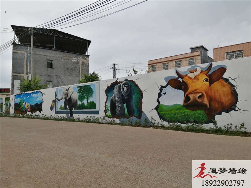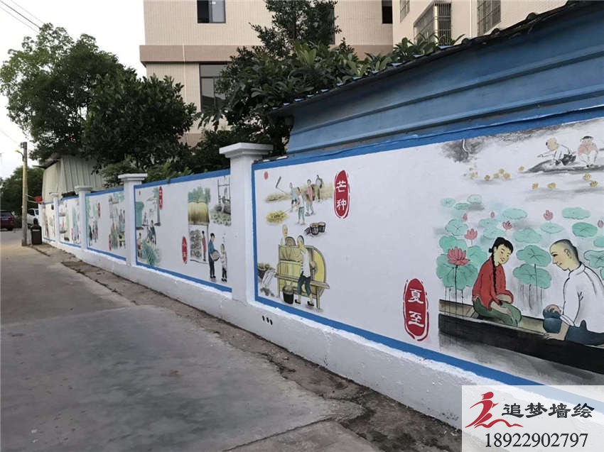 本司為這個項目設計了一些有關節氣勞作,鄉村產物,保護環境等主要內容,圖案選擇了符合鄉村氛圍的風格的平面畫。為了迎合鄉村的畫風,在選擇彩繪內容時,也進行了一些調整。其中動物選擇了視覺感強的3D墻繪,還有一系列綠色的環境風格,親近大自然