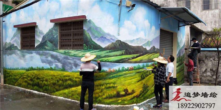 墻繪項目介紹:該項目的彩繪采用了寫實(shí)和場景相結(jié)合的方式,在適當(dāng)?shù)奈恢美L制與現(xiàn)實(shí)場景相結(jié)合的彩繪,給大眾以直觀的感受,避免了墻體的單調(diào)和乏味,這樣的的表現(xiàn)形式極具親和力,給人更驚喜的感受,凸顯了3D立體帶來的強(qiáng)烈視覺感,不但給人視覺上增大了空間,還能讓游客與墻體進(jìn)行互動,拍出更好的照片。圖案以鄉(xiāng)村環(huán)境和寫實(shí)畫風(fēng)結(jié)合,視覺感強(qiáng)。墻繪整體搶眼。共同創(chuàng)建更美麗的鄉(xiāng)村!
