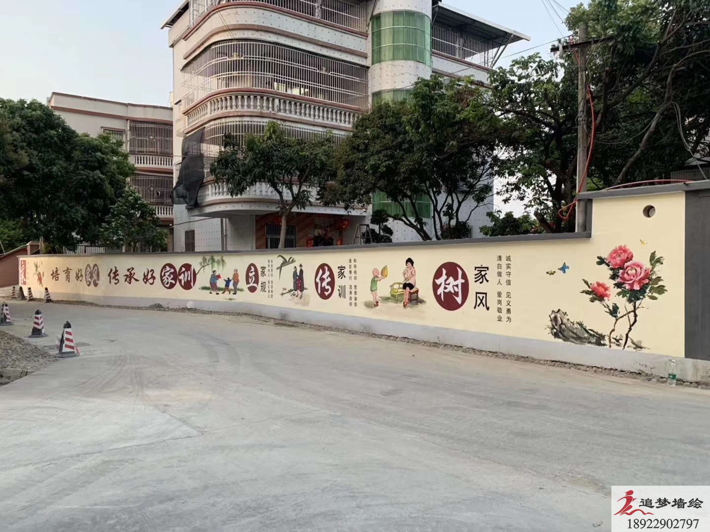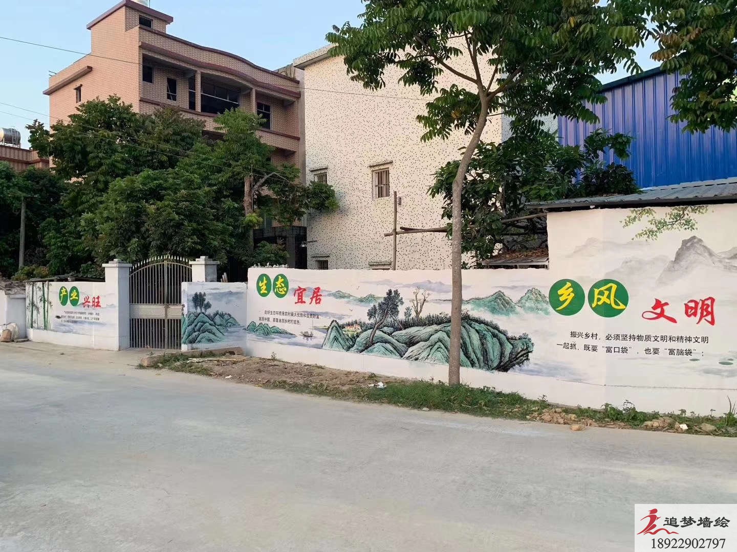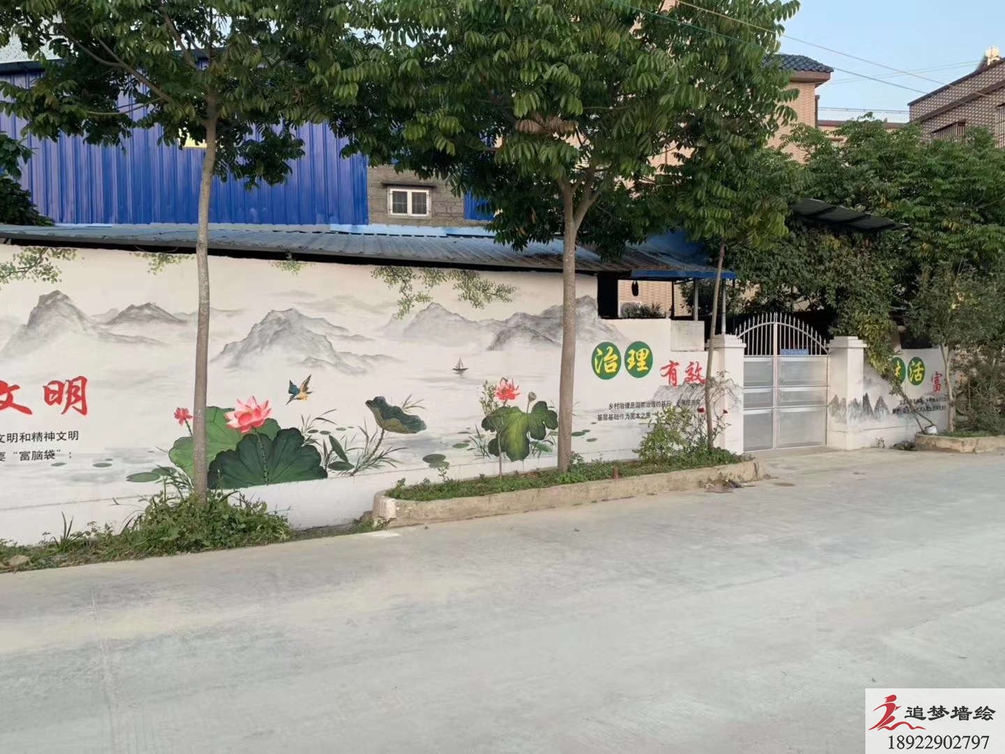 墻繪項目介紹:這次的項目主要繪制彩繪圖案整體設計圍繞鄉村振興戰略為主題,突出美化環境的主題。圖案是以鄉村氣氛為主的山水,荷花,采用圖文結合的表現形式,突出了自然。墻繪整體基調樂觀積極向上