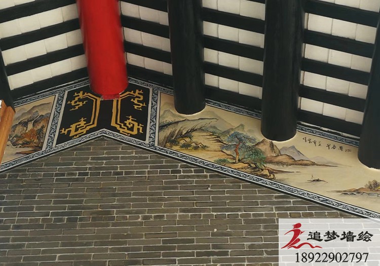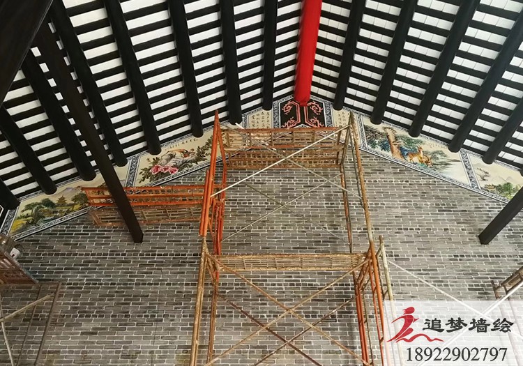 墻繪項目介紹: 這個項目的彩繪方式是和璽彩繪,金鳳和璽彩畫是建筑常見而重要的裝飾手法。它構圖嚴謹,圖案復雜一般只用于宮殿、壇廟等大建筑物的主殿,和璽彩繪表現了先進的營造技藝,又蘊涵著深厚的文化底蘊, 具有極高的美學價值、學術價值和使用價值。