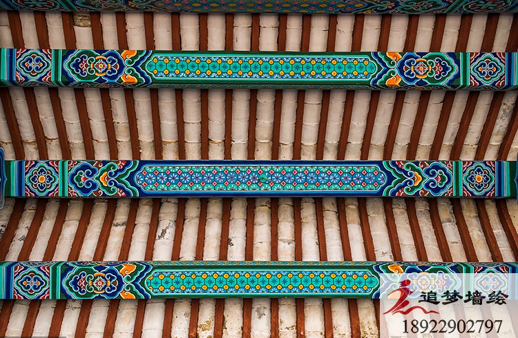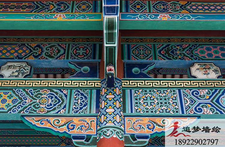 墻繪項目介紹: 這個項目的古建筑彩繪是根據嶺南文化進行彩繪圖案設計。是由蘇式、旋子、和璽彩畫融合而成的彩繪效果與其他古建筑彩繪風格大致一致,卻體現了當地特色習俗與審美。用豐富色彩把畫面做的精彩生動,色調明快,協調統一,具有地方特色。