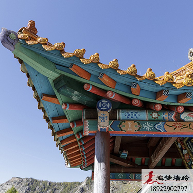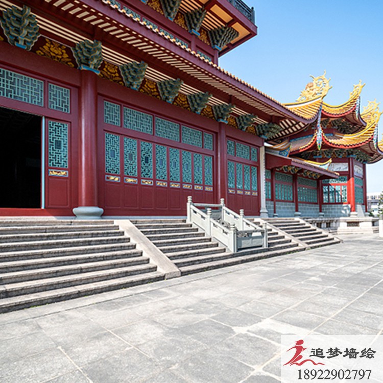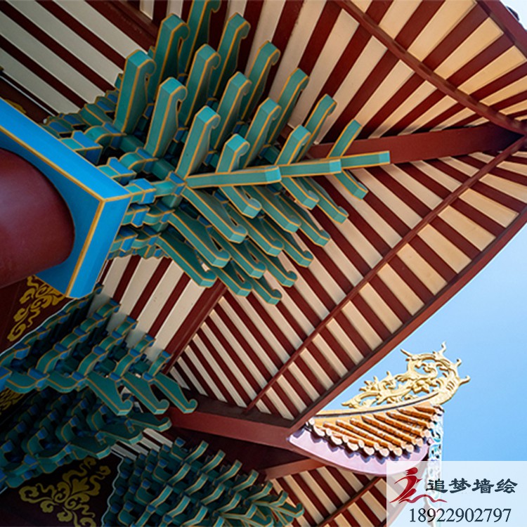 墻繪項目介紹:這個項目的古建筑彩繪是根據嶺南文化進行彩繪圖案設計。是由蘇式、旋子、和璽彩畫融合而成的彩繪效果與其他古建筑彩繪風格大致一致,卻體現了當地特色習俗與審美。用豐富色彩把畫面做的精彩生動,色調明快,協調統一,具有地方特色。